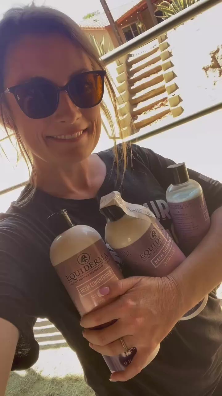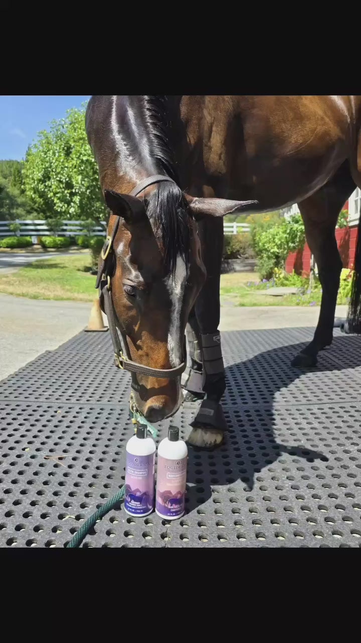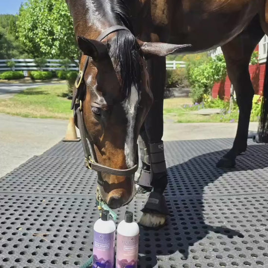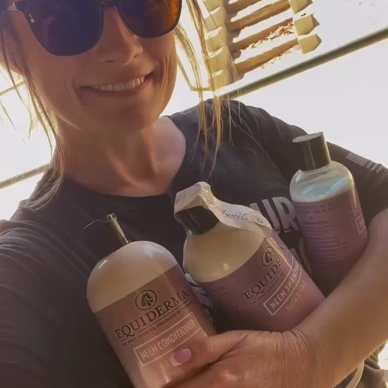 This naturally emollient, hydrating, and detangling conditioner strengthens, softens and soothes your horse's skin, mane, tail, and coat all at once for a soft, glossy glow. Infuse the epidermis and hair follicles with vitamin rich moisture, the kind that leaves the hair and skin luxuriously soft, protected from environmental stressors, and looking like a million bucks (the good kind)! Equiderma Conditioner imparts these enduring beneficial effects long after bath time. Our ingredients work long and hard to keep your horse looking and feeling their best. Using Equiderma Conditioner in tandem with Equiderma Shampoo is an excellent idea, but it can be used all on its own too.Β