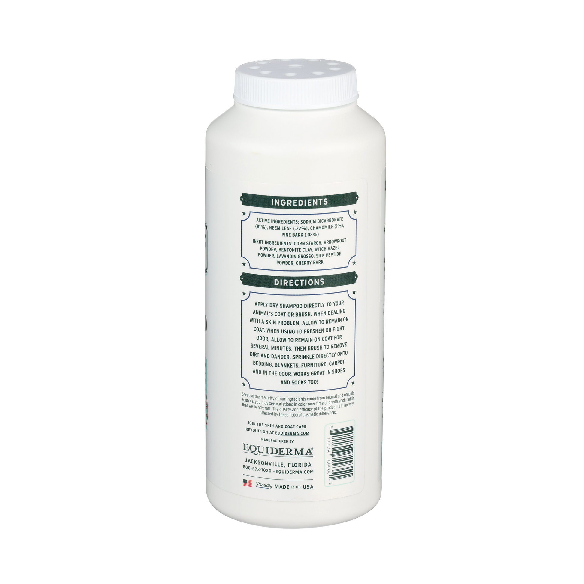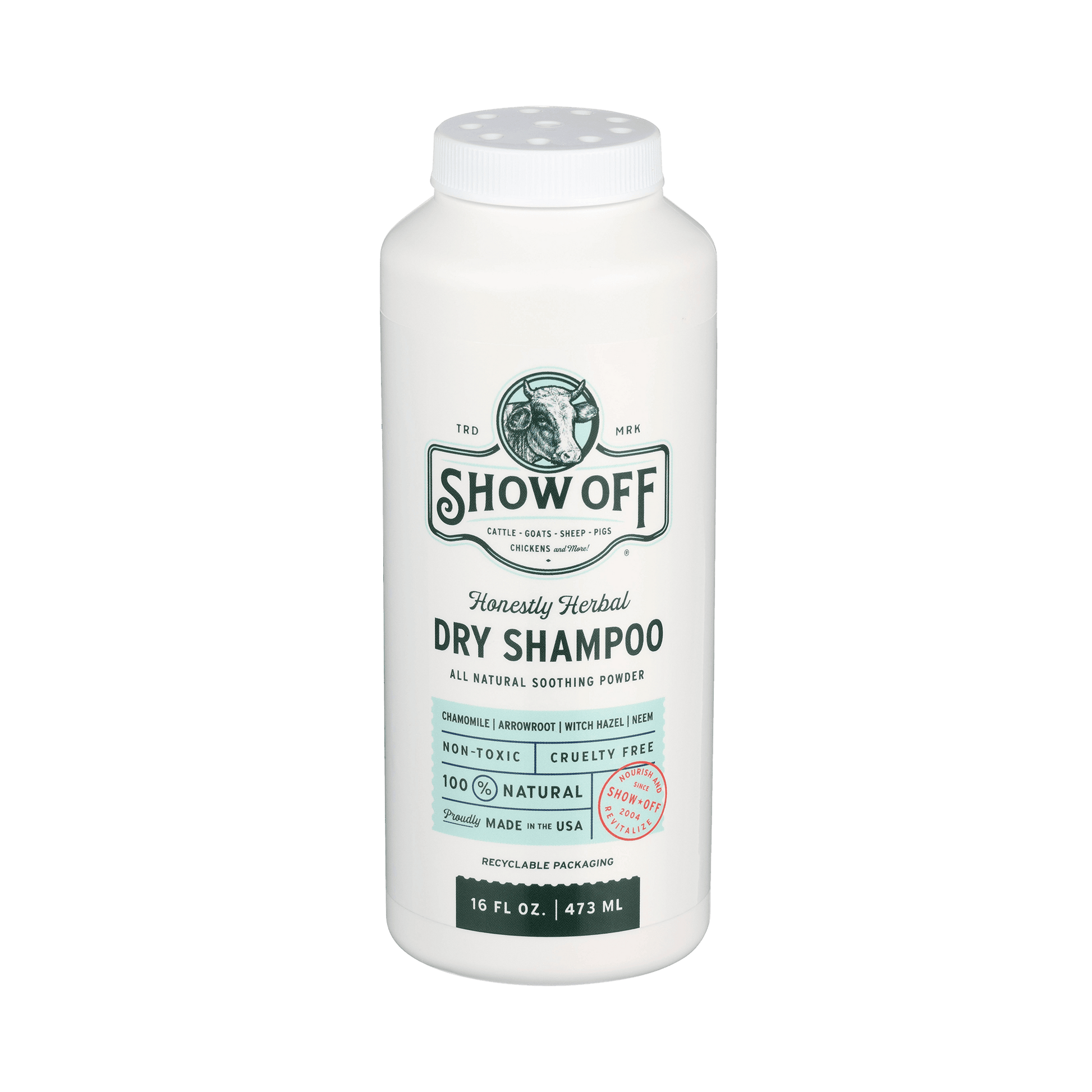 Show Off Dry Shampoo is honestly herbal! Use it for everything! Prevent odor, absorb and brush out dirt and unwanted moisture, prevent unwanted skin issues like rain scald (apply under blankets), when weather conditions are too cold for a wet bath, or just on-the-go. Works great in stall shavings or sprinkle in the coop. It's also the perfect way to freshen up at shows.
