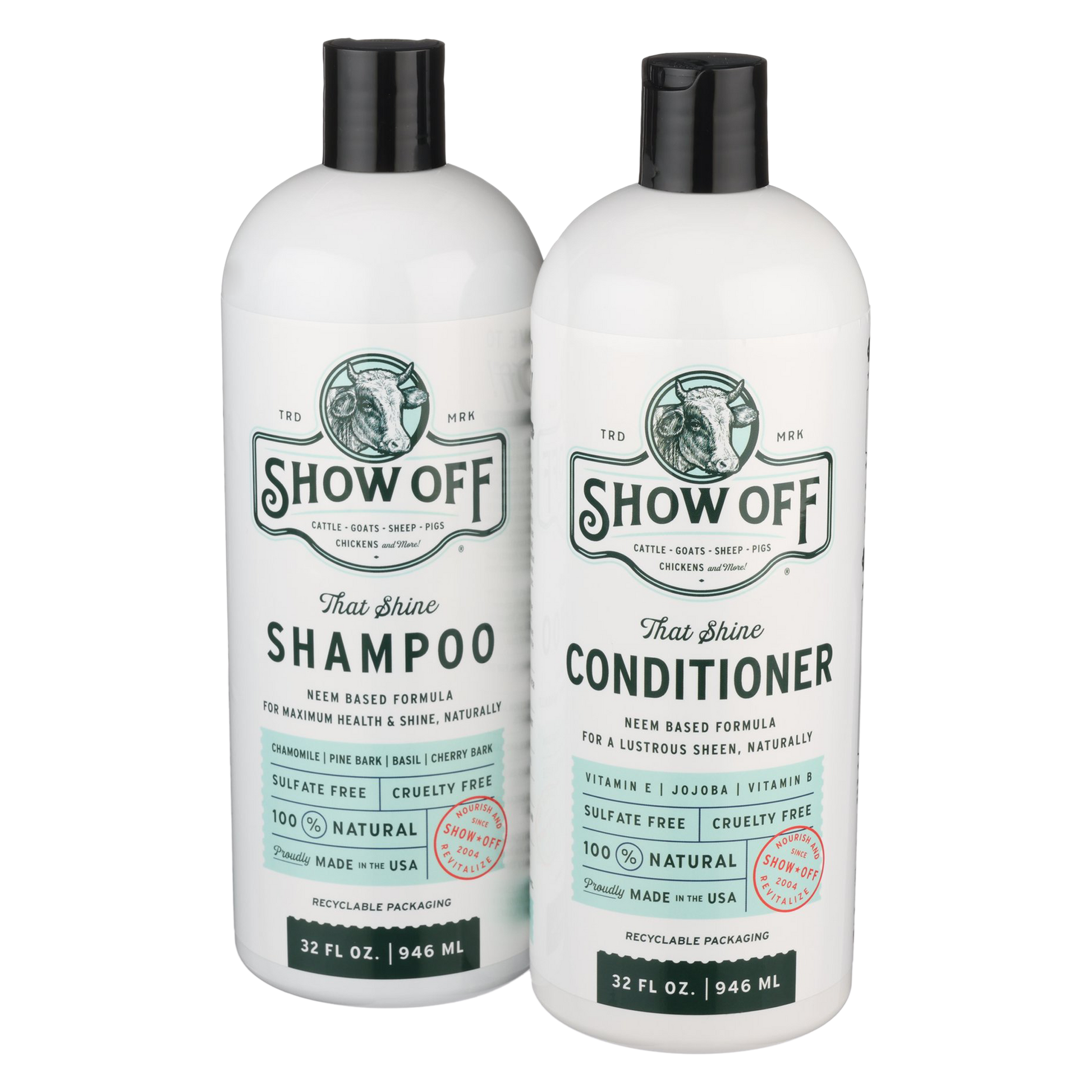 Just like us, livestock benefit from the use of both a cleansing shampoo and a hydrating conditioner, but Show Off has even more benefits. Naturally cleansing without harsh, oil-stripping ingredients, Show Off Shampoo is neem-based and designed to nurture and protect your livestock's holistic health. Born from botanicals, hydrating and emollient, Show Off Conditioner strengthens, softens and soothes your livestock's skin, coat and tail all at once for a soft, glossy glow. ๐๐ฎ๐๐ฆ๐ค